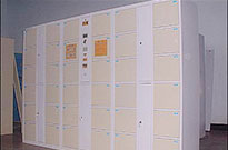 3、结构设计。由于锁具的不同和设计制作工艺的差别,电子存包柜在结构上分为有夹层和无夹层两种。对于寸土是金的超市来说,无夹层的存包柜较为节省占地面积。